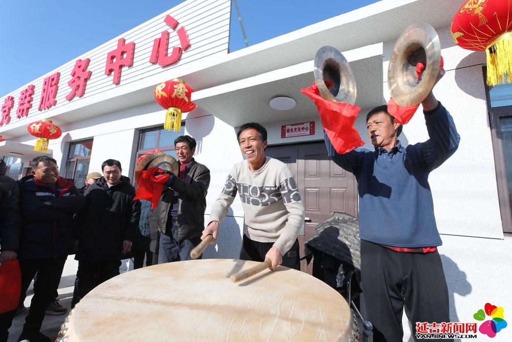 2025年1月28日,辽宁省葫芦岛市绥中县明水满族乡祝家沟村村民在重建新房的村党群服务中心前鸣锣击鼓。新华社发(田嘉 摄)