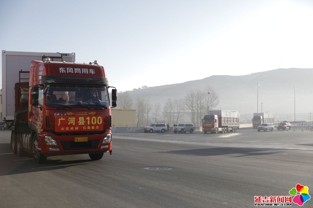 2023年12月26日,在甘肃省临夏州积石山高速出口,载着活动板房的货车驶向受灾乡镇。新华社记者 方欣 摄