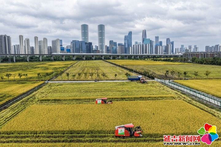 2025年10月21日,收割机在浙江省杭州市萧山区世纪田园粮食功能区的稻田里收割水稻,远处高铁列车飞驰而过(无人机照片)。新华社记者 徐昱 摄