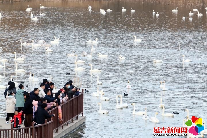 2025年12月20日,游人在河南省三门峡市天鹅湖国家城市湿地公园观赏天鹅。新华社发(牛书培 摄)