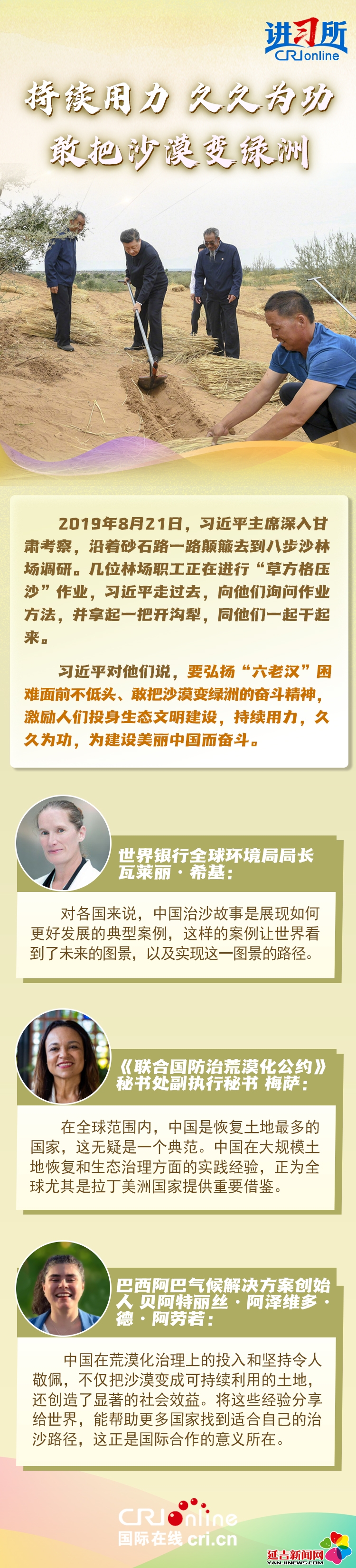 中共十八大以来,中国森林面积和蓄积量持续“双增长”,荒漠化和沙化土地面积持续“双缩减”,是全球增绿最多最快的国家。习近平主席始终身体力行:在北京连续14年参加首都义务植树活动,在甘肃与林场职工一起进行“草方格压沙”作业,在陕西亲自“验收”秦岭生态保护……