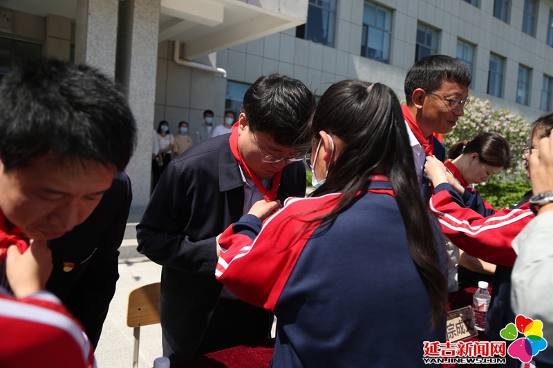 捐赠仪式上,学生代表为参加活动的领导佩戴了红领巾,延边大学农学院为太阳学校全体学生捐赠了58套春、夏季校服。