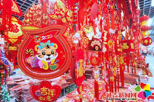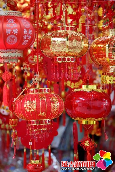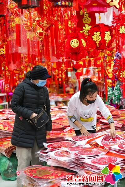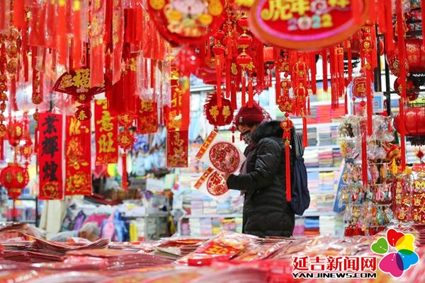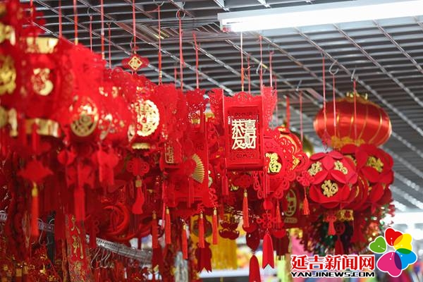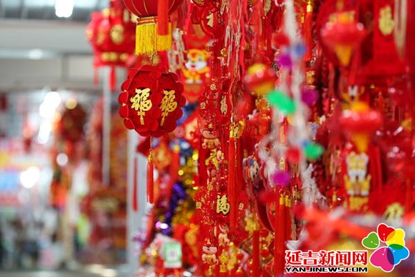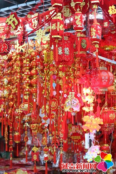 在延吉西市场内,新春装饰品摊床老板忙得不亦乐乎。摊床处挂满了红彤彤的灯笼、五彩缤纷的灯饰和写有美好寓意春联等装饰品,络绎不绝的市民早早地前来选购,为家里过年装饰做着准备。