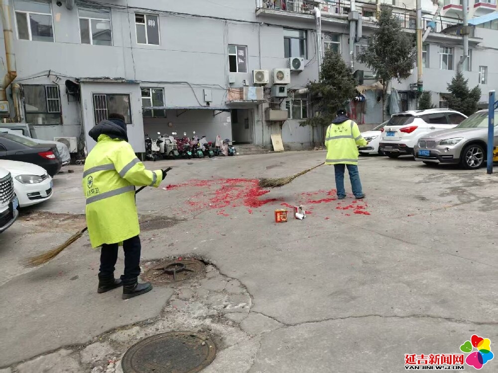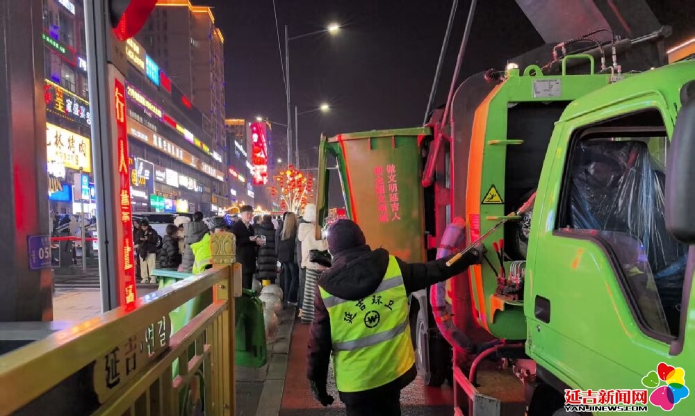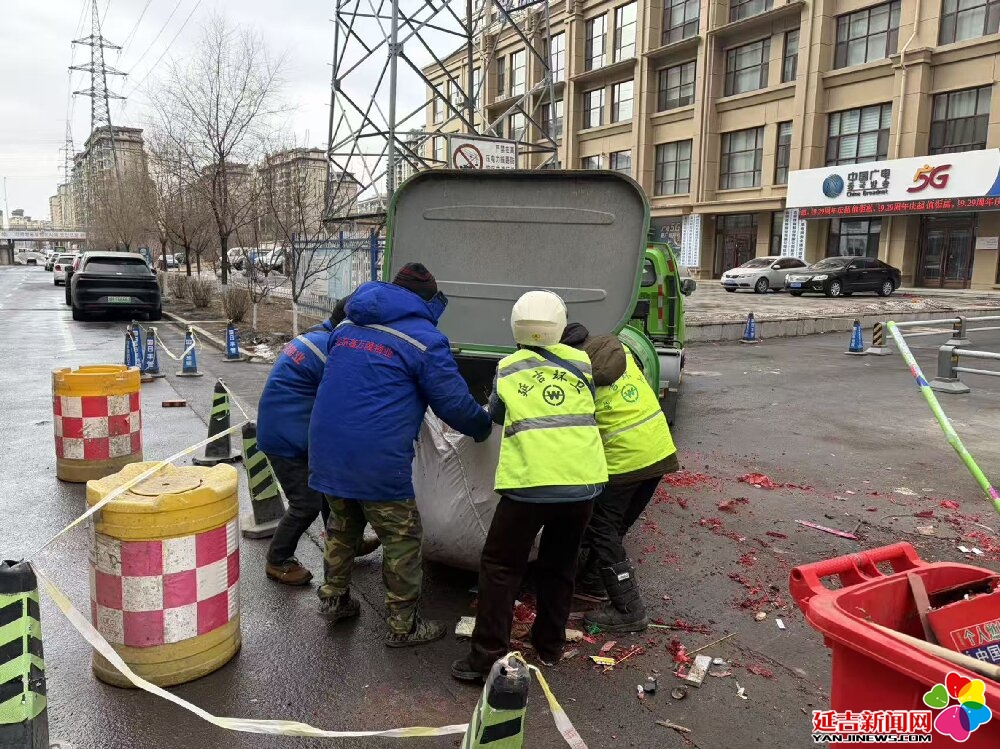 天刚蒙蒙亮,延吉的街头渐渐有了行人。在车流渐密的主干道,清运车辆缓缓停靠,环卫工人默契配合,将一袋袋垃圾搬上车;在热闹的商圈,身着荧光绿的身影穿梭在游客之间,及时清理散落的杂物,车身上“延吉环卫”四个大字格外醒目;在老旧小区的巷弄里,两名环卫工人正合力清扫着成片的炮竹碎屑,红色的碎屑在扫帚下汇聚,宛如铺在地上的“红地毯”。