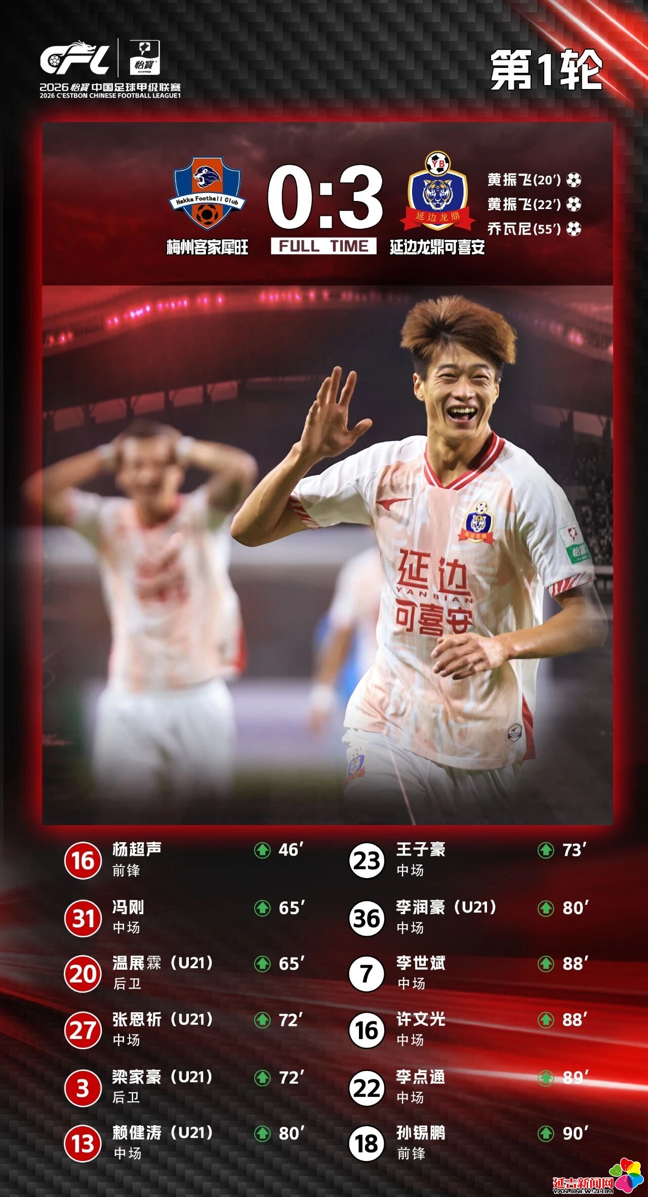 上半场比赛第20分钟,金泰延传中,黄振飞破门,延边龙鼎可喜安1:0领先。第22分钟,两分钟内双响,黄振飞内切兜射轰出世界波,延边龙鼎可喜安再下一城。