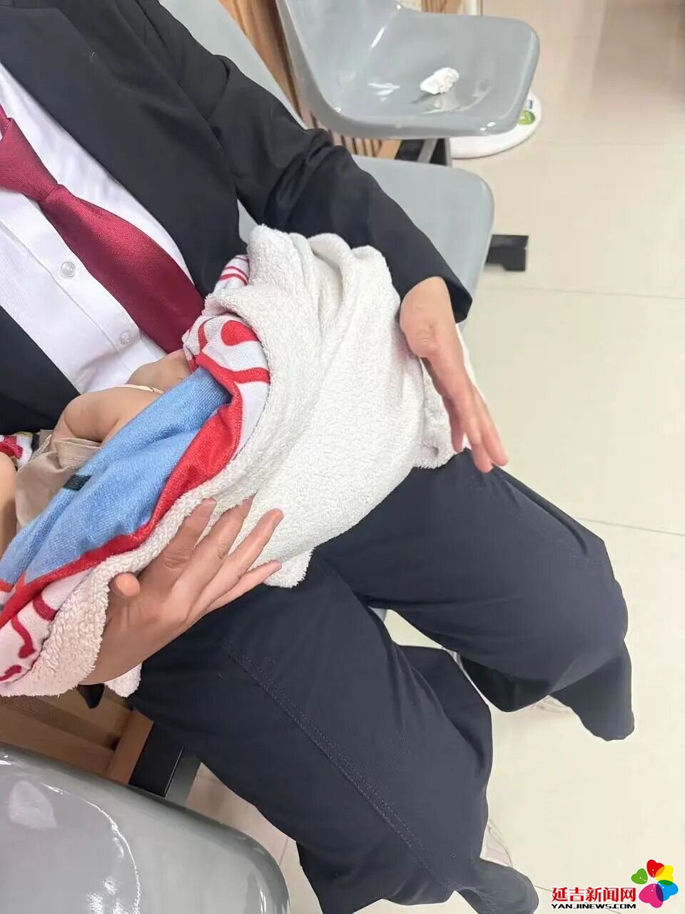 当天上午,延吉市人民法院民事审判二庭受理的一起民事案件即将开庭,当事人金某匆匆赶到法庭,怀中还抱着一名仅几个月大的婴儿。因家中无人照看孩子,金某便带着襁褓中的婴儿一同前来。面对即将开始的庭审和怀中哭闹的孩子,金某陷入两难境地,只能一边哄着孩子,一边准备庭审材料,神情满是焦急与窘迫。
