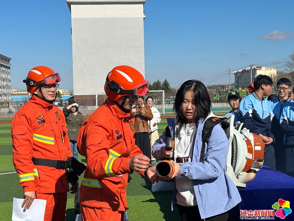 活动现场,延边消防救援机动支队应急通信和车辆勤务中队的指战员结合校园与山林实际,用通俗易懂的语言讲解火灾预防、火场逃生、报警流程、初期火情处置等核心知识,重点剖析春季森林防火要点,提醒师生远离野外用火、杜绝火源隐患。从破拆工具的演示操作,到风力灭火机、森林防火服等专业装备功能介绍,指战员耐心细致演示拆解,师生们认真聆听、踊跃提问,现场学习氛围浓厚。