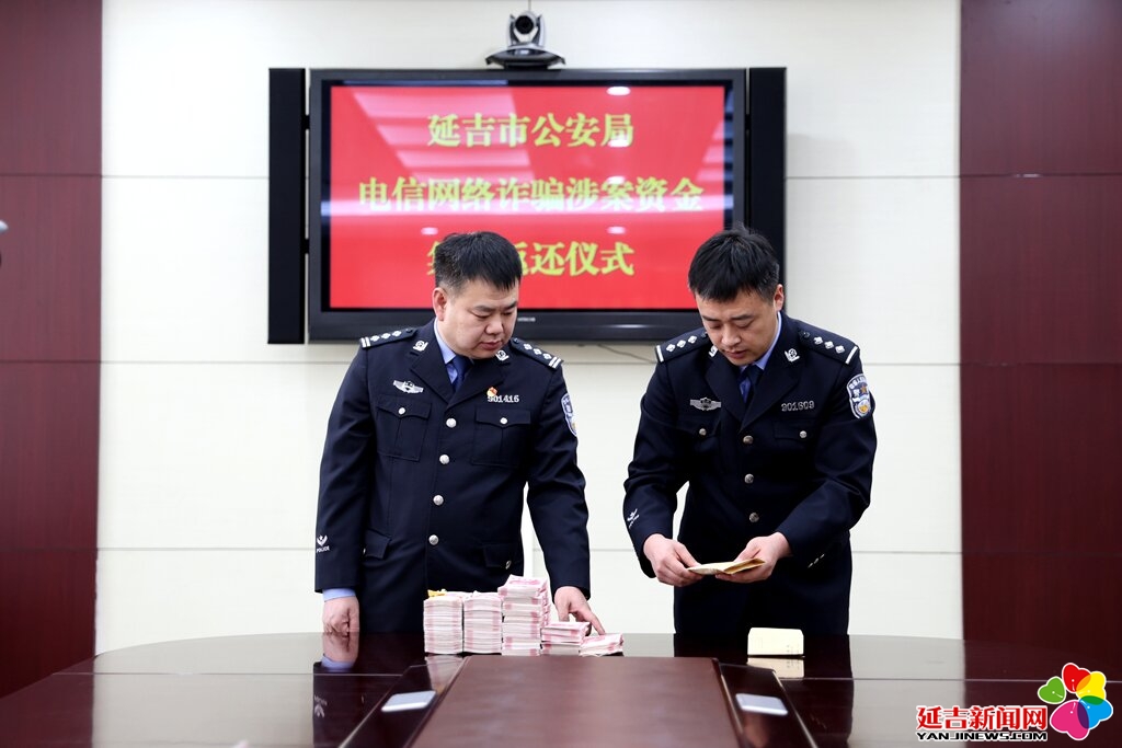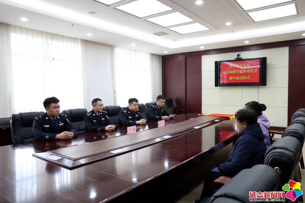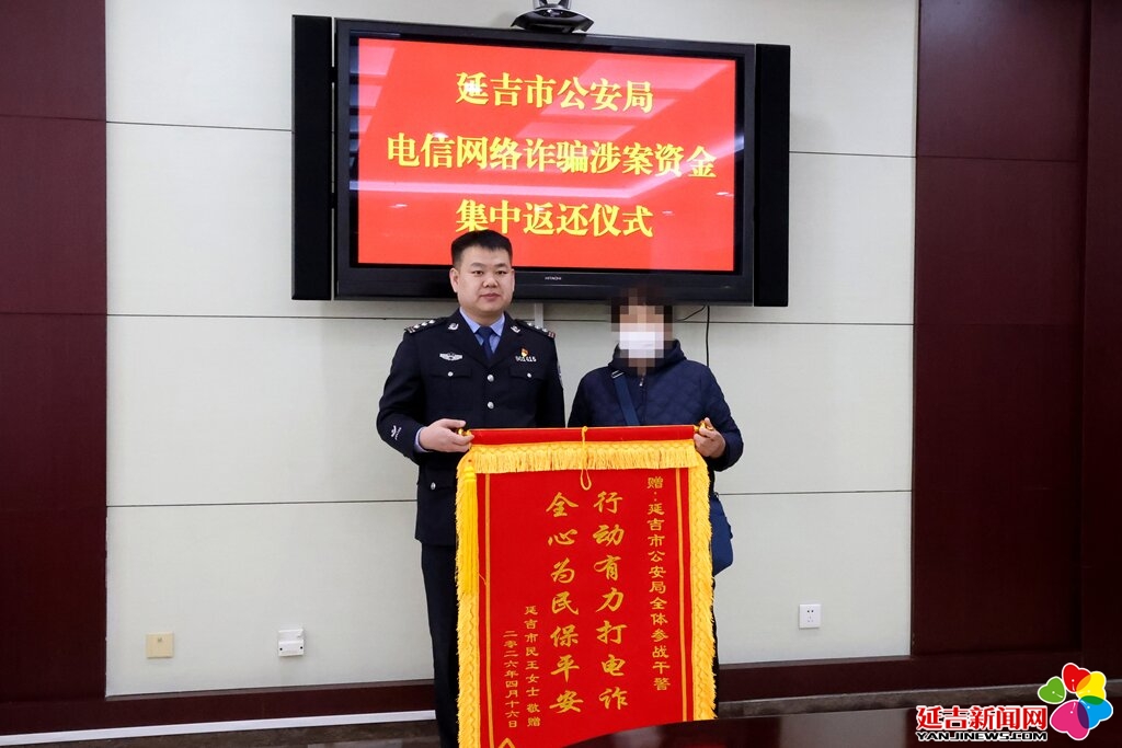 4月17日,延吉市公安局将36万元现金返还给张女士。张女士及家属制作了一面锦旗送给办案民警表示感谢。