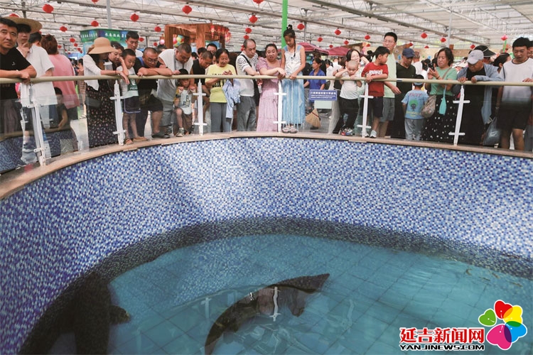 长春农博会渔业展馆内,“镇馆之宝”鲟鳇鱼吸引游客纷纷前来观赏。 (吉林日报记者 李姣月 摄)
