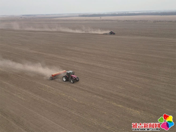 3月26日,在洮南圣一金地生物农业有限公司种植基地,1万多亩冰麦迎来开播季。大型播种机的轰鸣声将沉寂一冬的田野唤醒,一颗颗饱满的冰麦种子被精准播入沃土,洮南市春耕生产就此拉开帷幕。图为大型播种机正在进行冰麦播种作业。(吉林日报记者 张磊 摄)