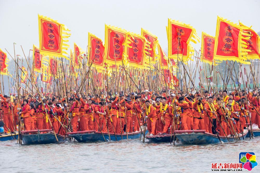 4月6日,2026年泰州姜堰溱潼会船节在江苏省泰州市姜堰区溱湖国家湿地公园开幕,数百条各式船只和上万名会船选手飞篙走桨,奋勇争先,演绎历久弥新的民俗画卷。