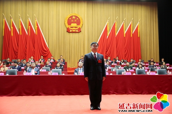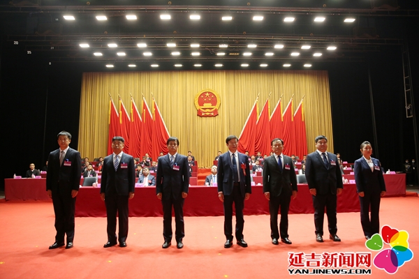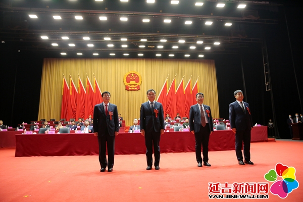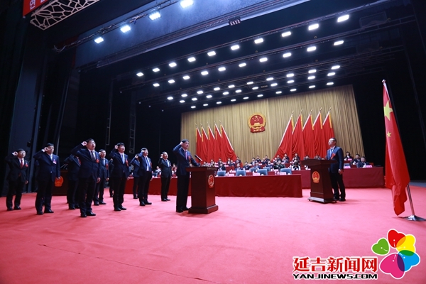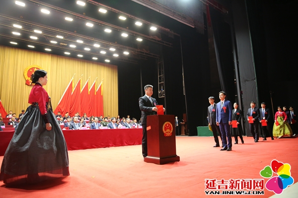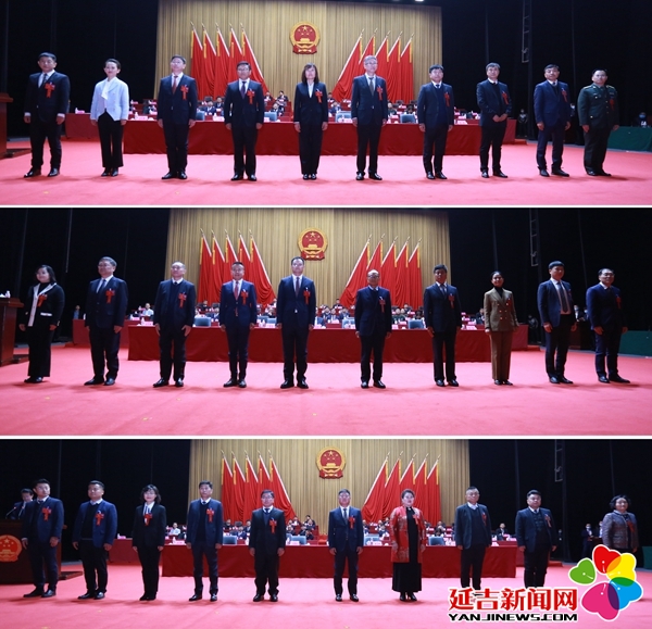 在代表们热烈的掌声中,新当选的延吉市第十九届人民代表大会常务委员会主任、副主任、委员,延吉市人民政府市长、副市长,延吉市监察委员会主任,延吉市人民法院院长,延吉市人民检察院检察长与代表见面,并进行宪法宣誓(市人民检察院检察长待州人大常委会批准后,另行宣誓)。