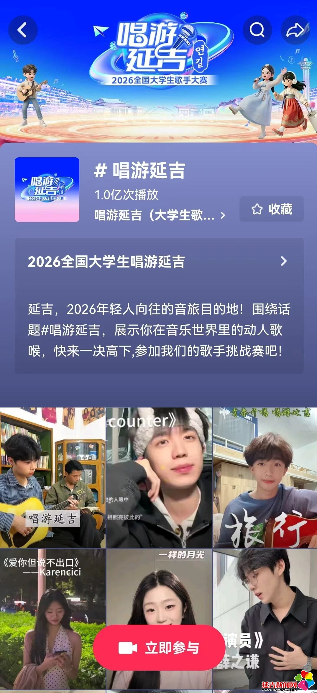目前,“唱游延吉”2026全国大学生歌手大赛仍在火热进行中,广大青年学子可登录抖音,搜索话题“唱游延吉”上传个人真人演唱视频,并@唱游延吉(大学生歌手大赛)官方账号,即可参与赛事,与全国高校学子同台竞技,在青春舞台上展现自我,用歌声传递对延吉的热爱,用青春书写属于自己的精彩。